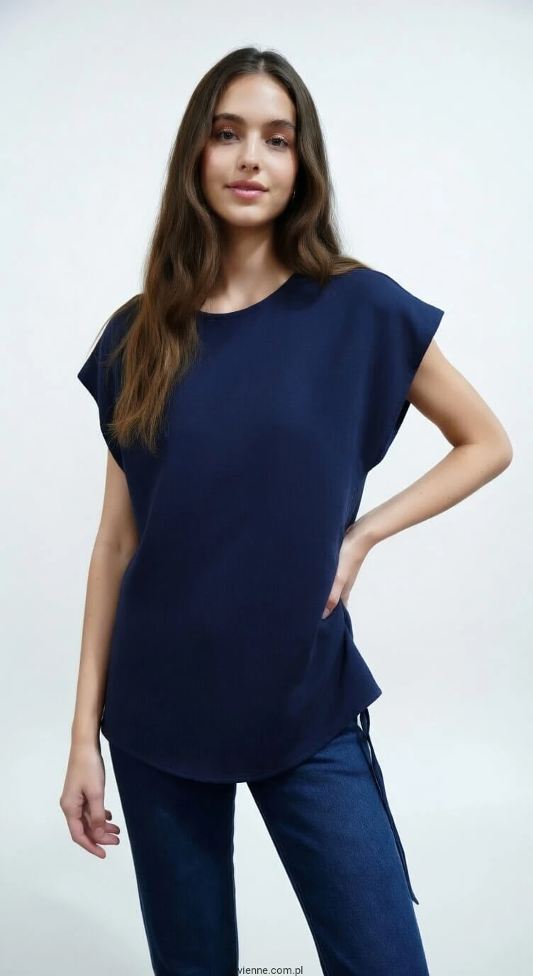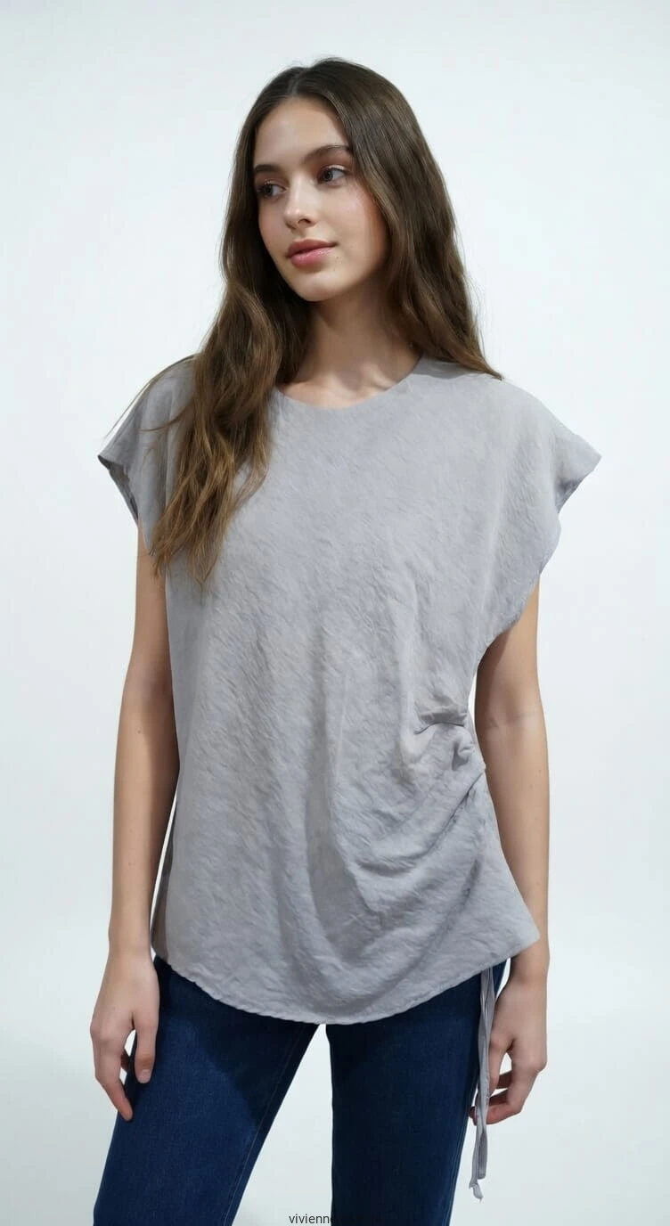 Kobieta bluzka o luźnym, oversize’owym kroju z efektownym asymetrycznym marszczeniem po bokach. Model wyróżnia się regulowanymi sznurkami, dzięki którym możesz dopasować stopień ściągnięcia i podkreślić talię według własnego uznania.