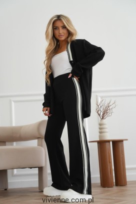 Zestaw składa się z bluzy w formie kardiganu zapinanej na napy oraz spodni z prostą nogawką. Sportowo-elegancki charakter podkreślają ozdobne paski wzdłuż nogawek oraz przy dekolcie, które optycznie wysmuklają sylwetkę i dodają całości modnego wyglądu.