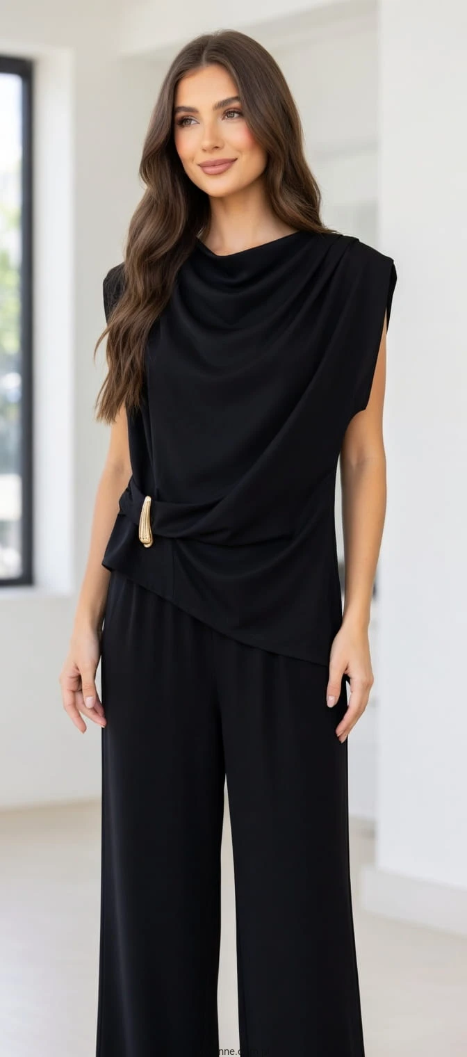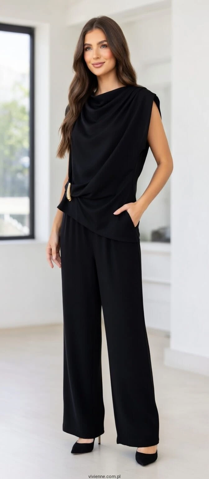 Stylowy komplet w klasycznym czarnym kolorze, który łączy elegancję z wygodą. Zestaw składa się z luźnej bluzki o kroju typu „woda” oraz spodni z szeroką, prostą nogawką, tworząc ponadczasową i bardzo kobiecą stylizację.